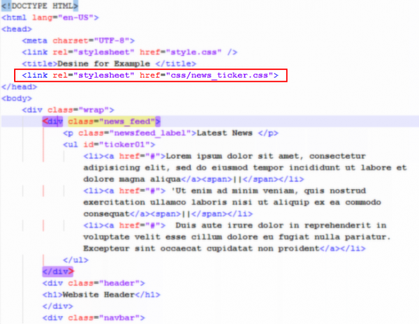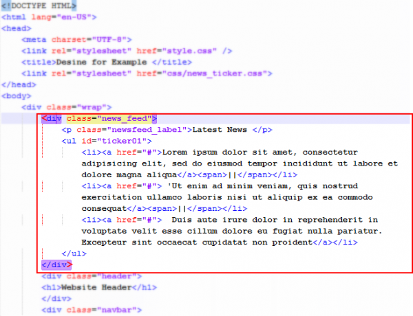 <div> <p>Latest News </p> <ul id="ticker01"> <li><a href="#">Lorem ipsum dolor sit amet, consectetur adipisicing elit, sed do eiusmod tempor incididunt ut labore et dolore magna aliqua</a><span>||</span></li> <li><a href="#"> 'Ut enim ad minim veniam, quis nostrud exercitation ullamco laboris nisi ut aliquip ex ea commodo consequat</a><span>||</span></li> <li><a href="#"> Duis aute irure dolor in reprehenderit in voluptate velit esse cillum dolore eu fugiat nulla pariatur. Excepteur sint occaecat cupidatat non proident</a></li> </ul> </div>