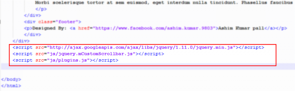<script src="http://ajax.googleapis.com/ajax/libs/jquery/1.11.0/jquery.min.js"></script> <script src="js/jquery.mCustomScrollbar.js"></script> <script src="js/plugins.js"></script>