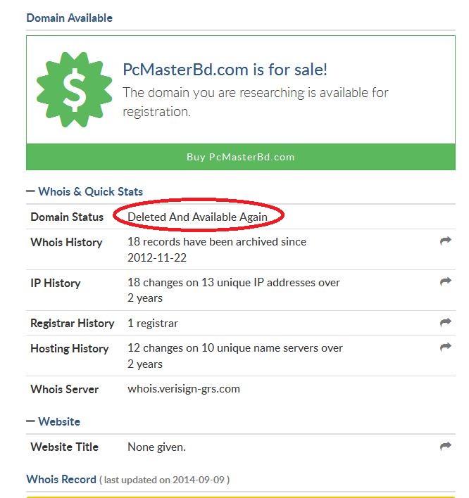 খ। এখানে বোঝা যাচ্ছে ডোমেইনটি বর্তমানে রেজি: এর উপযুক্ত। অবশ্য ১ বার রেজি: করে হয়েছিল ২২/১১/২০১২ তারিখে। ২ বছরের মধ্যে ১০ বার সার্ভার ডিএনএস পরিবর্তন/সেট করা হয়েছিল। এইভাবেই যে কোন ডোমেইনের তথ্যাবলী জানতে পারবেন। তাছাড়া এখানে কোন সাইটের এসইও স্কোর, ট্যাগ লাইন, সার্ভার ডিএনএস সম্পর্কে জানা যাবে।