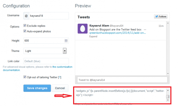 Add gadget> Html/ Java Script গিয়ে কোডটি পেষ্ট করুন । এবার সেভ করে বেরিয়ে এসে দেখুন আপনার ব্লগ এ টুইটার ফিড উইজেট যোগ হয়েছে । আরো জানতে এখানে ক্লিক করেন ।