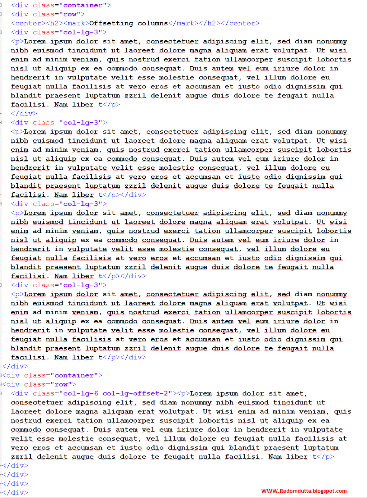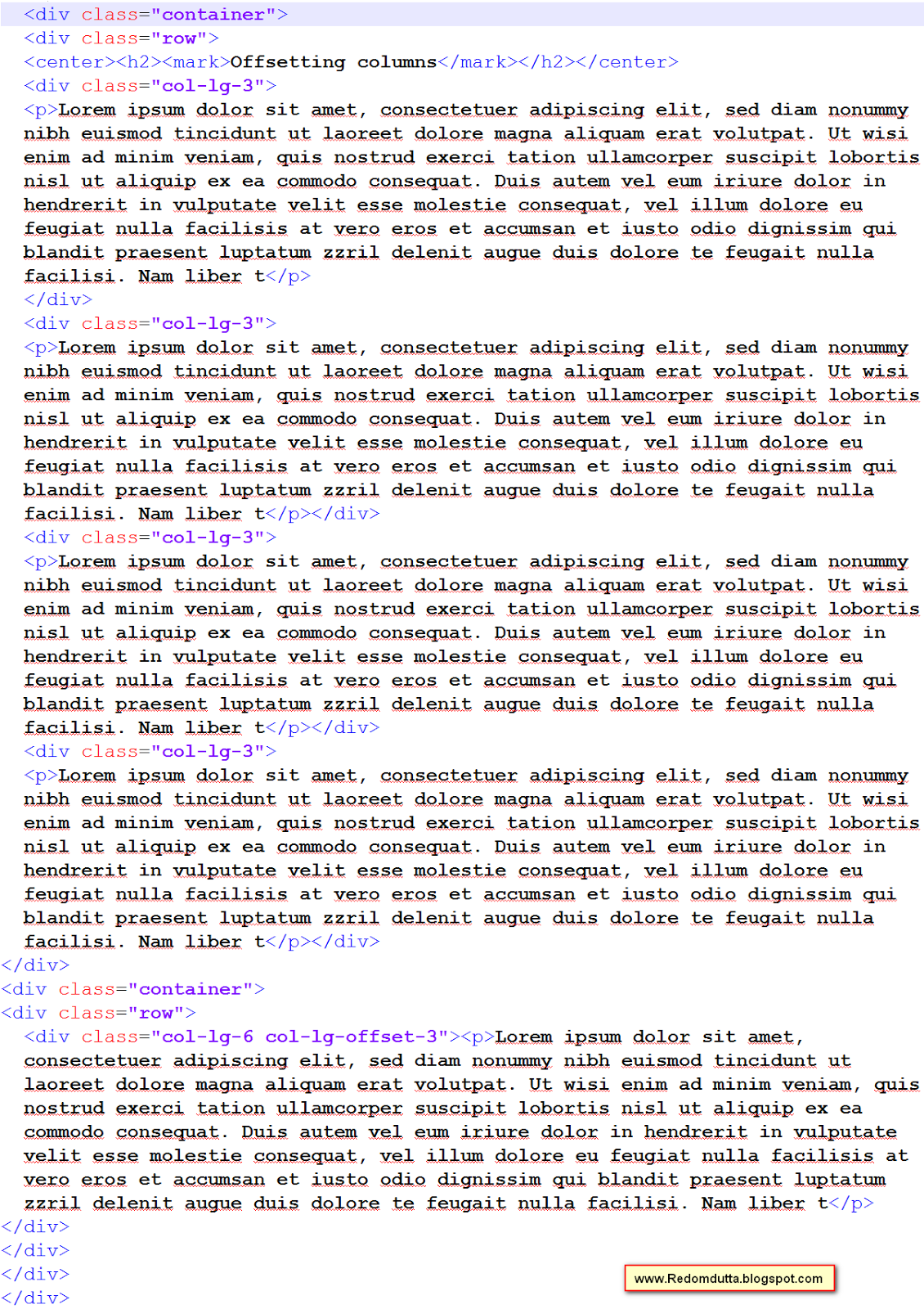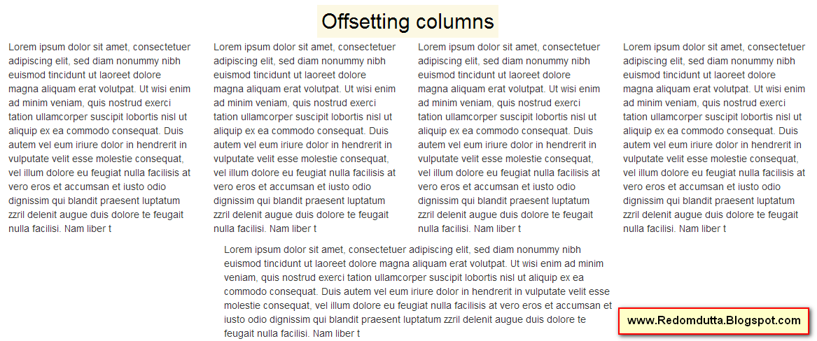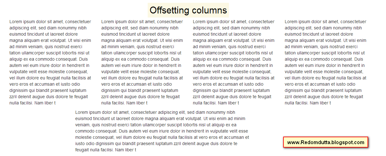 অফসেটইং কলাম এর মানে হল,আপনি যদি col-lg-offset-1 দেন সেক্ষেত্রে সে ডান দিকে এবং বাম দিকে এক ঘর খালি রাখবে। col-lg-offset-২ দিলে দুই দিকে ডানে বামে দুই ঘর খালি রাখবে। চলুন ব্যাপারটি বাস্তবে দেখা যাক।