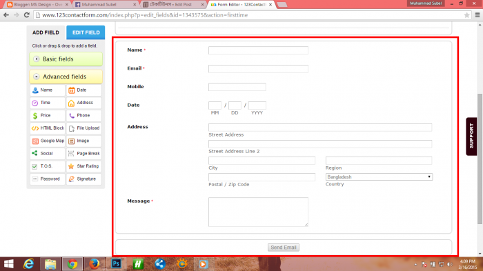 তারপর Form Name নামে আরেকটি পেইজ আসবে। সেখানে আপনার ফর্মের নাম দিয়ে OK বাটনে ক্লিক করুন। তারপর Editor page আসবে। সেখানে ডিফল্ট ফিল্ড হিসেবে Name, Email, Message এই তিনটি ফিল্ড দেওয়া আছে। এখন আপনার পছন্দ অনুযায়ী বাম পাশ থেকে ফিল্ড চোজ করুন। নিচে দেখুন আমি উদাহর স্বরূপ একটি ফর্ম তৈরী করেছি।