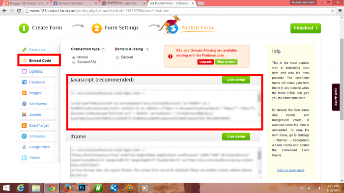 এখন বাম বাশে দেখুন Embed Code নামের একটা ট্যাব আছে। সেখান থেকে আপনি Javascript কোডটি কপি করে নিন।