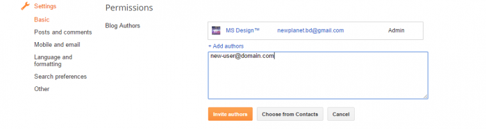 প্রথমে আপনার ব্লগার ড্যাশবোর্ডে প্রবেশ করুন। তারপর Setting > Basic এ ক্লিক করুন। এখানে দেখুন Permissions নামে একটি অপশন আছে। সেখানে Add Authors এ ক্লিক করে নতুন ইউজারের ইমেইল দিয়ে Invite author এ ক্লিক করুন।