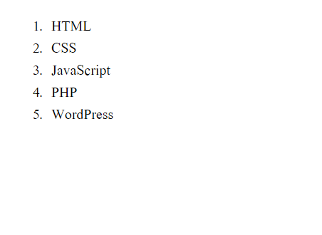 <!DOCTYPE HTML> <html> <head> <title> HTML Order List </title> </head> <body> <ol> <li> HTML </li> <li> CSS </li> <li> JavaScript </li> <li> PHP </li> <li> WordPress </li> </ol> </body> </html>