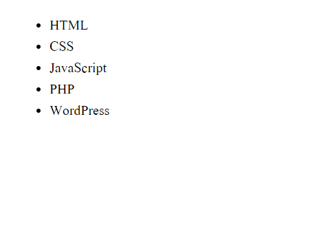 <!DOCTYPE HTML> <html> <head> <title> HTML Un Order List </title> </head> <body> <ul> <li> HTML </li> <li> CSS </li> <li> JavaScript </li> <li> PHP </li> <li> WordPress </li> </ul> </body> </html>