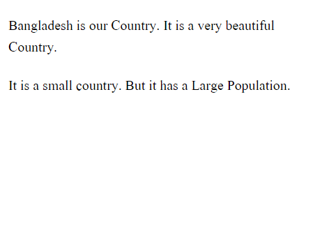 <!DOCTYPE HTML> <html> <head> <title> HTML Paragraph </title> </head> <body> <p> Bangladesh is our Country. It is a very beautiful Country. </p> <p> It is a small country. But it has a Large Population. </p> </body> </html>