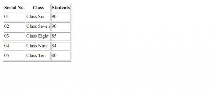<!DOCTYPE HTML> <html> <head> <title> HTML Table </title> </head> <body> <table border="1"> <tr> <th> Serial No. </th> <th> Class </th> <th> Students </th> </tr> <td> 01 </td> <td> Class Six </td> <td> 90 </td> <tr></tr> <td> 02 </td> <td> Class Seven </td> <td> 90 </td> <tr> </tr> <td> 03 </td> <td> Class Eight </td> <td> 88 </td> <tr> </tr> <td> 04 </td> <td> Class Nine </td> <td> 87 </td> <tr> </tr> <td> 05 </td> <td> Class Ten </td> <td> 89 </td> <tr> </tr> </table> </body> </html>