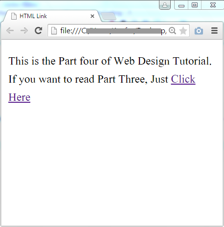 <!DOCTYPE HTML> <html> <head> <title> HTML Link </title> </head> <body> <p>This is the 5th Part of Web Design Tutorial. If you want to read Part Four, Just <a href="https://www.techtunes.io/web-design/tune-id/345321">Click Here</a> </p> </body> </html>