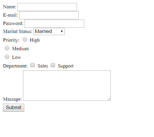 <!DOCTYPE HTML> <html> <head> <title> HTML Form </title> </head> <body> <form> Name: <input type="text" /> <br /> E-mail: <input type="text" /> <br /> Password: <input type="password" /> <br /> Marital Status: <select name="Status"> <option> Married </option> <option> Unmarried </option> </select> <br /> Priority: <input type="radio" name="priority" Value="High" /> High <br /> <input type="radio" name="priority" Value="Medium" /> Medium <br /> <input type="radio" name="priority" Value="Low" /> Low <br /> Department: <input type="checkbox" name="department" Value="Sales" /> Sales <input type="checkbox" name="department" Value="Support" /> Support <br /> Massage: <textarea rows="5" cols="30"> </textarea> <br /> <input type="submit" value="Submit" /> </form> </body> </html>