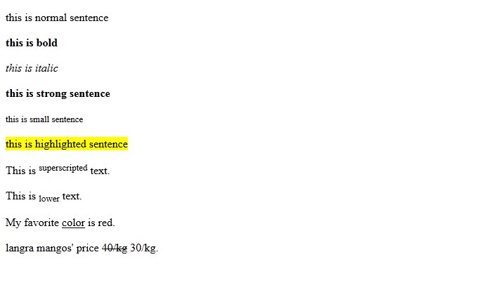 <!DOCTYPE html> <html> <head> <title>Title of your page which show on your title bar </title> </head> <body> <p>this is normal sentence</p> <p><b>this is bold</b> </p> <p><i>this is italic</i></p> <p><strong>this is strong sentence</strong></p> <p><small>this is small sentence</small></p> <p><mark>this is highlighted sentence</mark></p> <p>This is <sup>superscripted</sup> text.</p> <p>This is <sub>lower</sub> text.</p> <p>My favorite <ins>color</ins> is red.</p> <p>langra mangos' price <del>40/kg</del> 30/kg.</p> </body> </html>