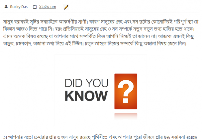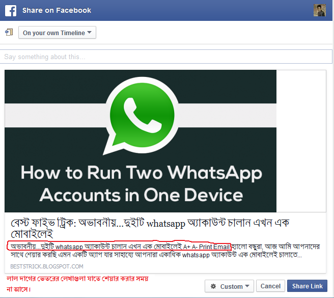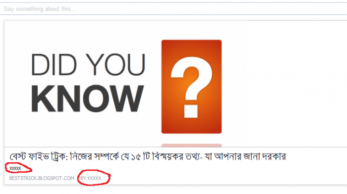 উপরের ছবি-১ (ব্লগ টিউন করার ছবি) তে টিউন শুরু করা হয়েছে হ্যালো বন্ধুরা,___ ইত্যাদি দিয়ে কিন্তু আমি যখন সেই টিউনটি ফেসবুকে শেয়ার করতে যায় তখন টিউনের টাইটেলসহ কিছু কথা আসছে। তাই আমি চাইছি ছবি-২ (ফেসবুকে শেয়ার করার সময় ছবি) তে লাল দাগের ভেতরের লেখাগুলো যাতে শেয়ার করার সময় না আসে।