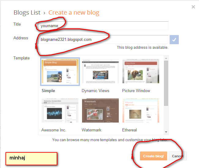 এইবারে যে পেজ টি আসবে আপনারা সেখানে একটা title set করুন। তারপর পরের ঘরে address দিন। এটাই হবে আপনার সাইট এর address . যে address দেবেন তার সাথে .blogspot.com যুক্ত হবে। এর পর simple tamplate select করে create blog এ ক্লিক করুন।