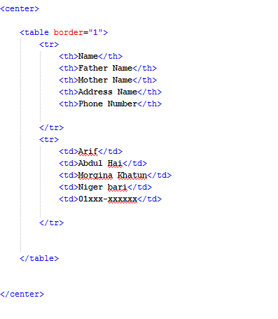 আপনারা যদি এইচটিএমএল ট্যাগের টিউন থেকে এইচটিএমএল শীটটি ডাউনলোড করে থাকেন এবং তা যদি পড়ে থাকেন তাহলে কোড গুলো বুজতে আপনাদের অসুবিধা হওয়ার কথা না। তাও আমি যেগুলোর সম্পর্কে আগে বলিনি সেগুলো সম্পর্কে বলছি। আপনারা এই ওয়েব পেইজ টাতে দেখতে পাবেন আমি একটি টেবিল তৈরি করেছি। টেবিল তৈরির নিয়ম হচ্ছে, প্রথমে আপনাকে <table> ট্যাগটি ব্যবহার করতে হবে। এই টেবিল ট্যাগটির শুরু এবং শেষ এর ভেতর আপনাকে রোঁ তৈরি করতে হবে। রোঁ তৈরি করার জন্য <tr> ট্যাগটি ব্যবহার করতে হবে। রোঁ তৈরির পর কলাম তৈরি করতে হবে এবং সকল প্রকার লিখা এই কলামের মধ্যে লিখতে হবে। আর কলাম তৈরি করার জন্য <td> ট্যাগ ব্যবহার করতে হবে। এক একটি কলামের জন্য এক একটি <td> ট্যাগ ব্যবহার করতে হবে। এখানে আপনারা দেখতে পাচ্চেন আমি table এর পাশে border="1" ব্যবহার করেছি। এটি একটি এট্রিবিউট যেটি শুধু মাত্র টেবিল এলিমেন্ট এ ব্যবহার হয়ে থাকে।