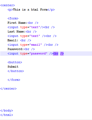 এখানে আপনারা দেখতে পাচ্ছেন আমি একটি ফরমও তৈরি করেছি। ফরম তৈরির জন্যও টেবিল এর মত <form> ট্যাগটি ব্যবহার করা হয়েছে। এছাড়া এলিমেন্ট হিসেবে ইনপুট ব্যবহার করা হয়েছে এবং এই ইনপুট এর একটা টাইপও দেওয়া হয়েছে। এই টাইপ এর কাজ হচ্ছে আপনি কি ধরনের ইনপুট তোকাছেন তা নির্বাচন করা। আপনার এইচটিএমএল শিটটি যদি ভালো ভাবে পড়ে থাকেন তাহলে আপনারা এর সম্পর্কে বুজতে পারবেন।