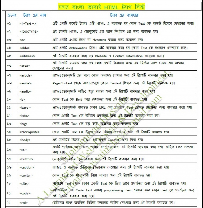 শুরুতে শুভেচ্ছা রইল সম্মানিত প্রযুক্তি প্রেমি সকল ভাই ও বোনদের প্রতি। ওয়েব ডিজাইন এ নতুন শিক্ষার্থীদের জন্য সহায়ক হিসেবে সহজ বাংলাই HTML5 এর প্রয়োজনীয় সকল Tag গুলোর সম্ননয়ে আমার তৈরি এই Tag List টি। জানিনা কেমন হয়েছে তবে চেষ্টা করেছি সবোর্চ্চ প্রচেষ্টা দিয়ে সর্ব উত্তম ভাবে তৈরি করতে। এতে HTML5 এর ৮৫টি Tag সহজ বাংলাই অনুদিত হয়েছে। এই লিস্টটি ভাল ভাবে সম্পূর্ন করতে পারলে HTML5 ট্যাগ এ আর তেমন একটা সমস্যা থাকবে বলে আমার মনে হয় না। লিস্টটে প্রদত্ত ট্যাগ গুলো বুঝতে কোন প্রকার সমস্যা হলে আমাকে Comment এর মাধ্যমে জানাতে পারেন। আমি সর্বোচ্চ চেস্টা করব আপনাদের সকল Comment এর উত্তর দেওয়ার জন্য। এই ট্যাগ লিস্টটি সকলের উপকারের কথা চিন্তা করে শেয়ার করলাম আপনাদের সাথে। আশা করি সকলে উপকৃত হবেন ইন্শাল্লাহ।