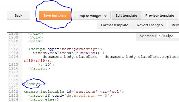 তারপর বামপাশের মেনু থেকে template click করুন তারপর edit html click করুন. এরপর KEYBOARD এর CTRL + F চাপুন দেখবেন search box চলে আসবে সেখানে </body> এটি পেষ্ট করুন. </body> এই টেগটি খুজে বের করুন. </body> টেগের আগে আপনার পছন্দের বাটনের কোটটি পেষ্ট করুন.