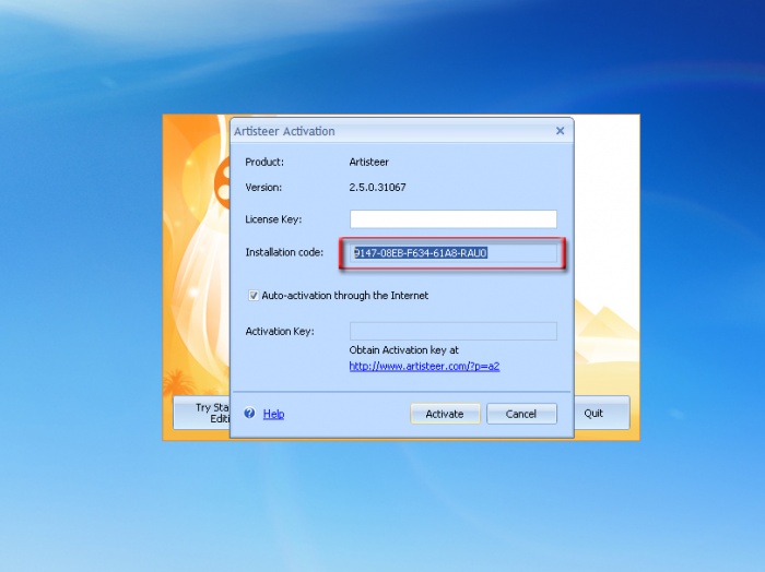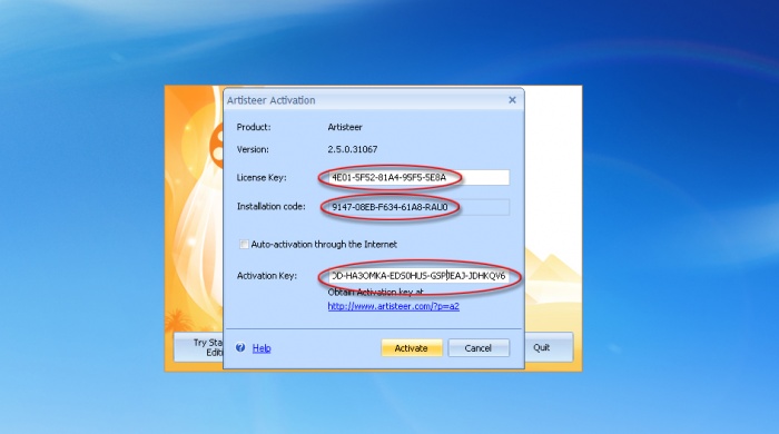 মূল এ্যাপ্লিক্যাশন থেকে Auto-activation throught the Internet এর পার্শ্বের টিক’টি তুলে দিন এবং লাইসেন্স কী এবং এ্যাক্টিভেশন কোড পেস্ট করে Active করে নিন।
