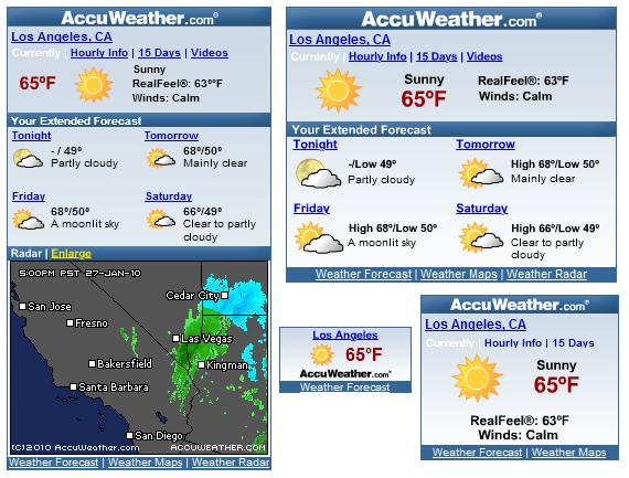 AccuWeather-এ সম্পূর্ণ আবহাওয়া তথ্য নিয়ে ব্লগ, মাইস্পেস এবং ওয়েবসাইটের জন্য সাজানো হয়েছে।রেজিষ্টেশন এর প্রয়োজন হয়না, খুব সহজেই আপনার শহর, ইউনিট এবং ভাষা সিলেক্ট করে আপনার মনের মত widget পেয়ে যাবেন এখানে। এর ওয়েব এড্রেস হল: http://www.accuweather.com