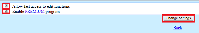 উপরের ছবির মত Allow Fast Access To Edit Functions এবং Enable Premium Pogram এ টিক মার্ক দিন এবং Change Setting বাটনে ক্লিক করুন। এবং Back To Main Page Button এ ক্লিক করুন।