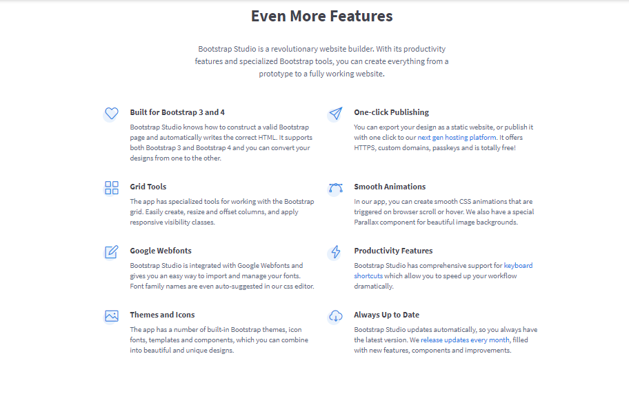 Bootstrap Studio সফটওয়্যারে রয়েছে আরও অতিরিক্ত ফিচার যা আপনার কাজের গতিকে আরও বহু গুনে বৃদ্ধি ও আরও ইফেক্টিভ পদ্ধতিতে ওয়েব সাইট ডেভেলোপ করতে সাহায্য করবে। নিচে এক এক করে সবগুলো ফিচার নিয়ে আলোচনা করা হল।