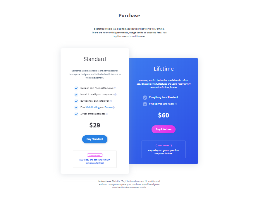 Bootstrap Studio সফটওয়্যারটি হচ্ছে একটি ডেস্কটপ অ্যাপ্লিকেশন যা আপনি সম্পূর্ণ অফলাইনে ব্যবহার করতে পারবেন। এর জন্য আপনাকে কোনও মাসিক ফি, ব্যবহারের সীমা বা চলমান ফি নেই। আপনি যদি এই সফটওয়্যারটি একবার কিনেন তাহলে আপনি চিরদিনের জন্য এর মালিক হয়ে যাবেন। নিচ থেকে এর প্যাকেজ সমূহ এক নজরে দেখে নেই।