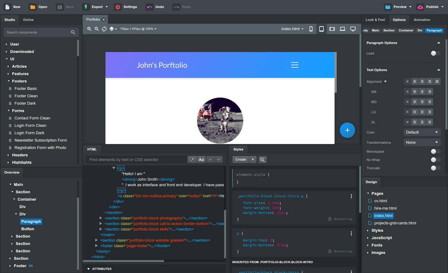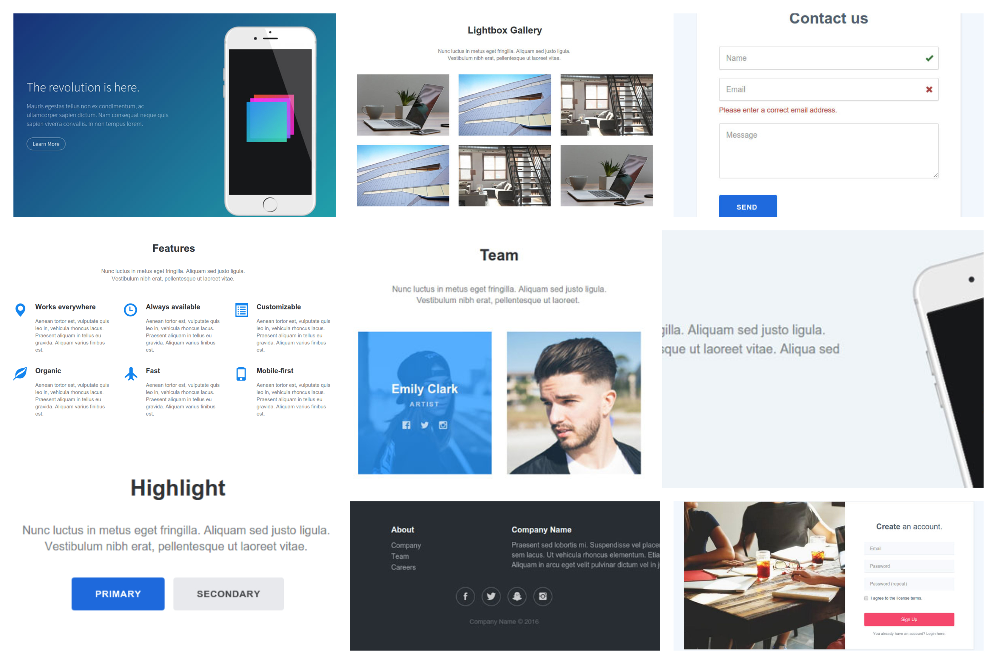 Bootstrap Studio সফটওয়্যারে রেস্পন্সিভ ওয়েব পেইজ তৈরির জন্য প্রচুর সংখ্যক সুন্দর বিল্ট-ইন কম্পোনেন্ট দিয়ে তৈরি করা যেমন: হেডার্স, ফুটার্স, গ্যালারী, স্লাইড-শো এবং এমনকি স্প্যান এবং ডিভসের মতো বেসিক ইলিমেন্ট গুলো রয়েছে এই সফটওয়্যারে। এছাড়াও আরও অনেক কম্পোনেন্ট রয়েছে যেমন: Smart Drag & Drop, Create Your Own Components, Online Library, Linked Components ইত্যাদি। নিচ থেকে কিছু নমুনা দেখুন।