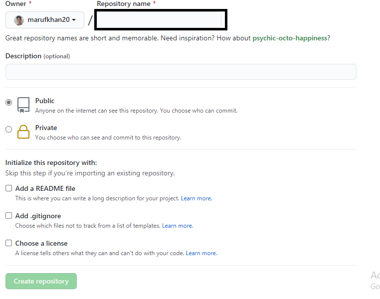 এখানে থাকা Repository Name বক্সে আপনার প্রজেক্টের একটি নাম দিন। তারপর Create repository বাটনে ক্লিক করুন। তাহলে আপনার নতুন প্রজেক্ট তৈরি হয়ে যাবে।