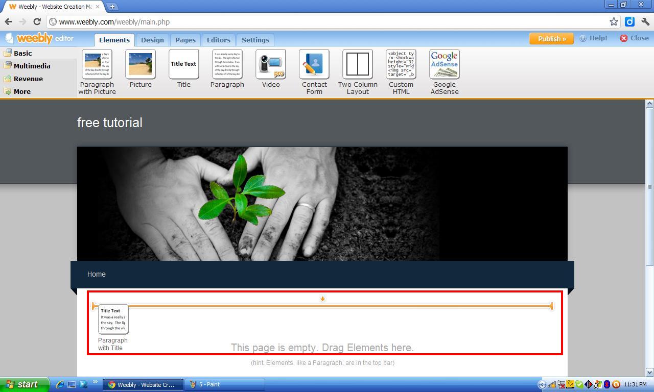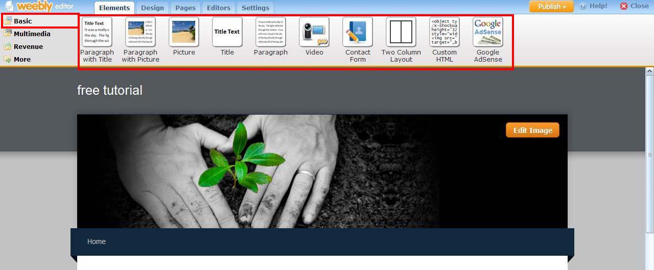 ৮.এবার চলুন ভেতরের আলোচনায় যাই। নিচের চিত্রটি দেখুন। Elements এর অন্তর্গত Basic এর আন্ডারে অনেকগুলো অপশন রয়েছে। যেমন প্যারাগ্রাফ উইথ টাইটেল, পিকচার, ভিডিও সহ অনেক কিছু। এগুলো শুধু ধরে ধরে ড্রাক করে নিচে বসিয়ে দিলেই হবে।