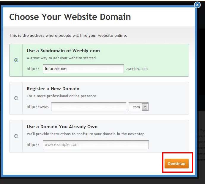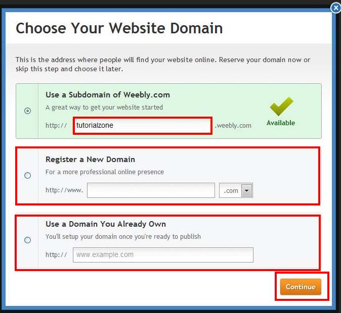৪. এরপরে আপনি আপনার সাইটের ঠিকানা বা ইউ আর এল লিখুন পছন্দ অনুযায়ী। সেটি খালি থাকলে টিক চিহ্ণ দেখাবে। ( আপনি ইচ্ছা করলে খালি নামটির .com অন্য যে কোন প্রিমিয়াম ডোমেইনও কিনতে পারেন। অথবা আপনার পূর্বে থাকা কোন ডোমেইনও এটির সাথে connect করতে পারেন। যা পরবর্তীতে লাল দাগ দিয়ে ভরাটকৃত অংশে দেখানো হয়েছে।) এরপরে continue বাটনে ক্লিক করুন।