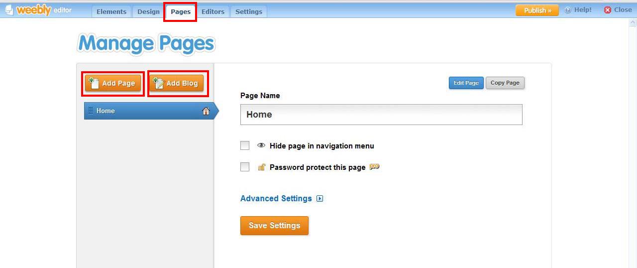 ১৫. এরপরে চলুন পেইজ সেকশনে যাই। নিচের চিত্র দেখুন। সেখানে গিয়ে add page এ ক্লিক করে নতুন পেইজ তৈরী করা যাবে। add blog এ ক্লিক করে আপনার সাইটে ব্লগিং চালু করতে পারেন।