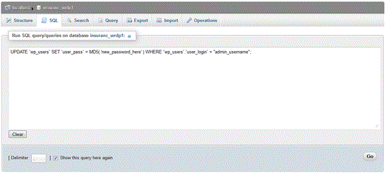 UPDATE `wp_users` SET `user_pass` = MD5( "new_password_here" ) WHERE `wp_users`.`user_login` = "admin_username";