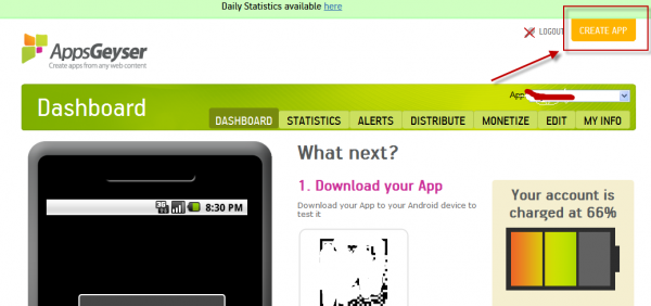 ১। প্রথমেই এই http://www.appsgeyser.com সাইটে গিয়ে লগিন করুন বা একাউন্ট তৈরী করে নিন (আপনার ফেসবুকে একাউন্ট দিয়েও লগিন করতে পারেন)