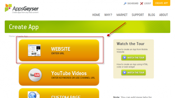 ৩। এরপর আপনার ওয়েবসাইটের জন্যে এপস বানাতে চাইলে নিচের মত বাটনটি(Website) ক্লিক করুন