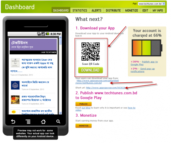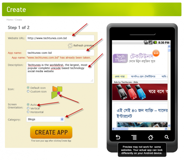 ৫। সবকিছু ঠিক থাকলে "Create APP" বাটনে ক্লিক করে এপস বানানো শেষ করুন এবং পরের পেইজ এ ডাউনলোড লিঙ্ক থেকে আপনার এন্ড্রয়েড সেট এ ডাউনলোড করে দেখে নিন। টেকটিউন্স এর জন্যে বানানো এপস দেখতে চাইলে ডাউনলোড করে দেখতে পারেন এই লিঙ্ক থেকে