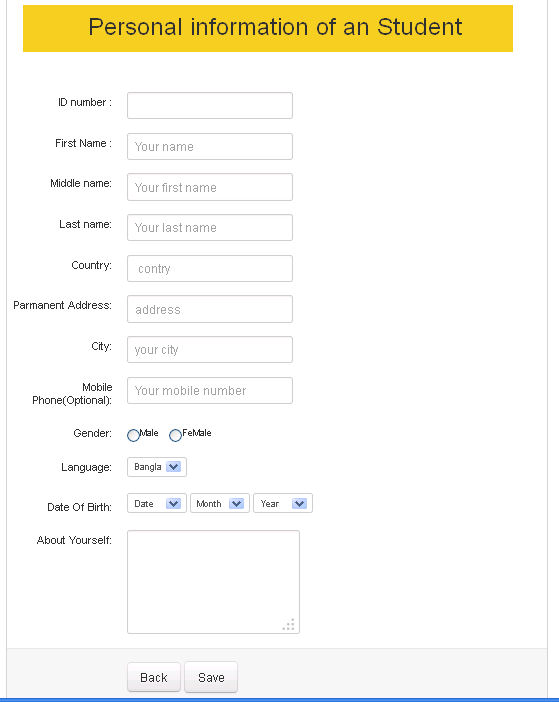 এটি ফরম যেটা আমরা first বানাবো। এটাই যখন save button click করব তখন একটা নতুন পেইজ এ নিয়ে যাবে যেটা নিচের ছবির মত।