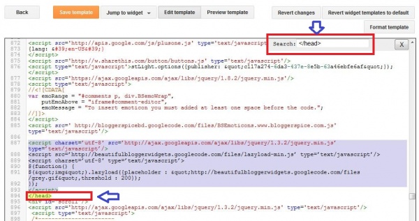৩। Now click on Edit HTML button > Find (Ctrl + F) </head>