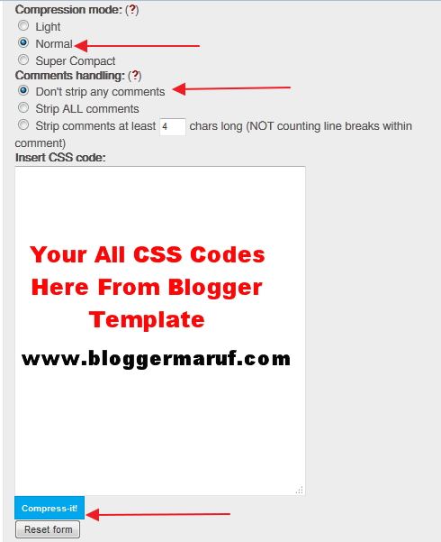 ব্লগস্পট গুরুদের স্বাগতম। আপনাদের জ্ঞানের ঝুলিতে আজ আরও একটি ব্লগস্পট সংক্রান্ত পোস্ট শেয়ার করে যাচ্ছি। তাহলে রেডি হয়ে নিন। সফল ব্লগ প্রতিষ্ঠা করতে নানা দিকে নজর দিতে হয়। তেমনই একটি বিশেষ দিক হলো ব্লগের স্পিড সর্বোচ্চ গতির ব্যবস্থা করা। মনে রাখবেন ব্লগের লোডিং স্পিড শুধু ইন্টারনেটের স্পিডেই নির্ভর করেনা। স্লো নেটেও সম্ভব দ্রুত গতির লোডিং স্পিড ব্যবস্থা করা। এজন্য প্রয়োজন সঠিক জ্ঞান এবং সেগুলো প্রয়োগ। অপেক্ষায় থাকুন সকল টিপস ধীরে ধীরে শেয়ার করব। সঠিক অপটিমাইজেশন আপনার ব্লগকে করে তুলবে রকেট গতির। তবে আরেকটি কথা মাথায় রাখবেন যে, স্পিড বাড়ানোর সকল টিপস প্রয়োগের পরই আপনি পাবেন ফাইনাল গতি। আজ শেয়ার করছি এমনই একটি টিপস যার মাধ্যমে আপনার ব্লগস্পট ব্লগের সিএসএস অপটিমাইজেশনের মাধ্যমে সিএসএস জনিত অতিরিক্ত লোডিং টাইম কমিয়ে আনবে। সিএসএস অপটিমাইজেশনের কথায় আবার ভাবছেন এটা আবার কিভাবে করব? চিন্তা নেই। সেই সহজ বন্দোবস্তও রয়েছে। ব্যবহার করতে পারেন যেকোন CSS Compressor Tools । আপনি আপনার পছন্দের যেকোন টুল ব্যবহার করে সিএসএস কোড কমপ্রেস করে নিতে পারেন। চাইলে আমার সিএসএস কমপ্রেস টুল টিও ব্যবহার করতে পারেন। এজন্য নিচের ধাপগুলো অনুসরণ করুন।