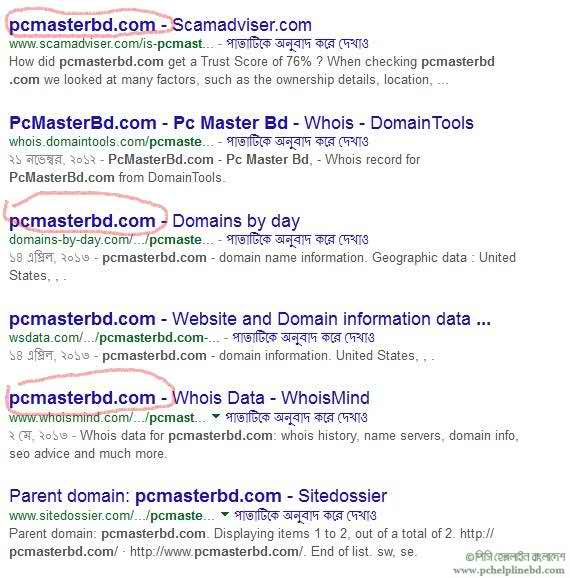 যেমন: আমি অনেক দিন পূর্বে pcmasterbd.com নামে একটি ডোমেইন নিয়ে ছিলাম। পরবর্তীতে রেজি: রিনিউ না করার কারনে সেটি বাদ হয়ে যায়। বর্তমানে উক্ত ডোমেইনটি যে কেউ নিজের নামে রেজি: করতে পারবেন। কিন্তু তাই বললে তো হবে না। দেখতে হবে ডেড লিংক কিরুপ? তাহলে গুগল সার্চে pcmasterbd.com নাম লিখলেই নিচের চিত্র আসবে। সেখানে দেখা যাচ্ছে অনেক ডেড লিংক তাহলে ডোমেইনটি রেজি: না করাটাই ভালো।