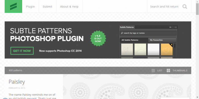 প্যাটার্ন ওয়েবসাইটের জন্য খুবই গুরুত্বপূর্ণ । এখন প্রায় প্রত্যেকটি ওয়েবসাইট এ প্যাটার্ন ব্যবহার করা হয় । অনেকে ফটোশপ এ প্যাটার্ন তৈরি করে ব্যবহার করেন । তবে, আপনি যদি প্যাটার্ন তৈরি করতে না পাড়েন তাহলে Subtle Patterns ব্যবহার করতে পাড়েন । এখানে, আপনি প্রায় 400 টি প্যাটার্ন পাবেন ।