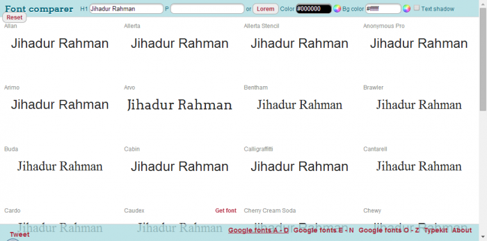 কিছু ওয়েবসাইট এ ফন্ট ব্যবহার করার সময় কোন ফন্ট ব্যবহার করবেন - এটা নিয়ে আমরা প্রায়ই দ্বিধায় পড়ে যায় । এই সমস্যার সমধান দিবে Font Comparer টুল । এই টুল ব্যবহার করে একটি ওয়ার্ড বিভিন্ন ফন্ট এ কেমন দেখা যাবে তা জানতে পারবেন ।