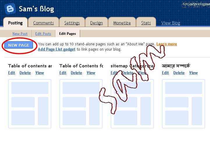 নিচের ছবির মত posting এ যান। তারপর দ্বিতীয় সারিতে সবচেয়ে ডানে বা তিন নং এ অর্থাৎ Edit Page এ ক্লিক করুন। New page এ ক্লিক করুন