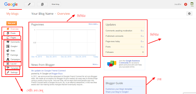 আপনার ব্লগ এর ডেশবরড টা হবে নিচের ছবির মতন...। এই ডেসবরড থেকে ই আপনার ব্লগ এর সকল কাজ করতে পারবেন...। কিছু করার নাই করতে হবে :p