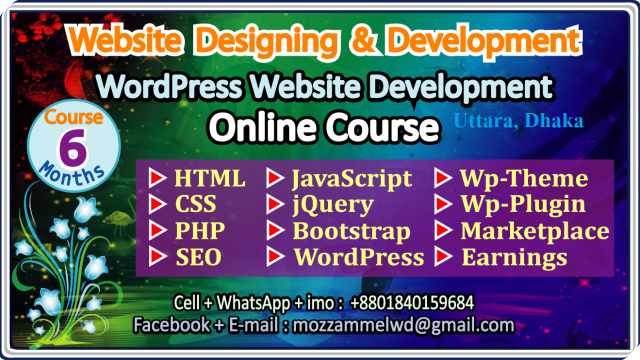 Website Designing & Development Online Course for 4 months (html, css, javascript, jquery, php, bootstrap, wordpress. wordpress theme and plugin, Wordpress theme development) +8801531728466 [email protected] https://www.facebook.com/mozzammelwd