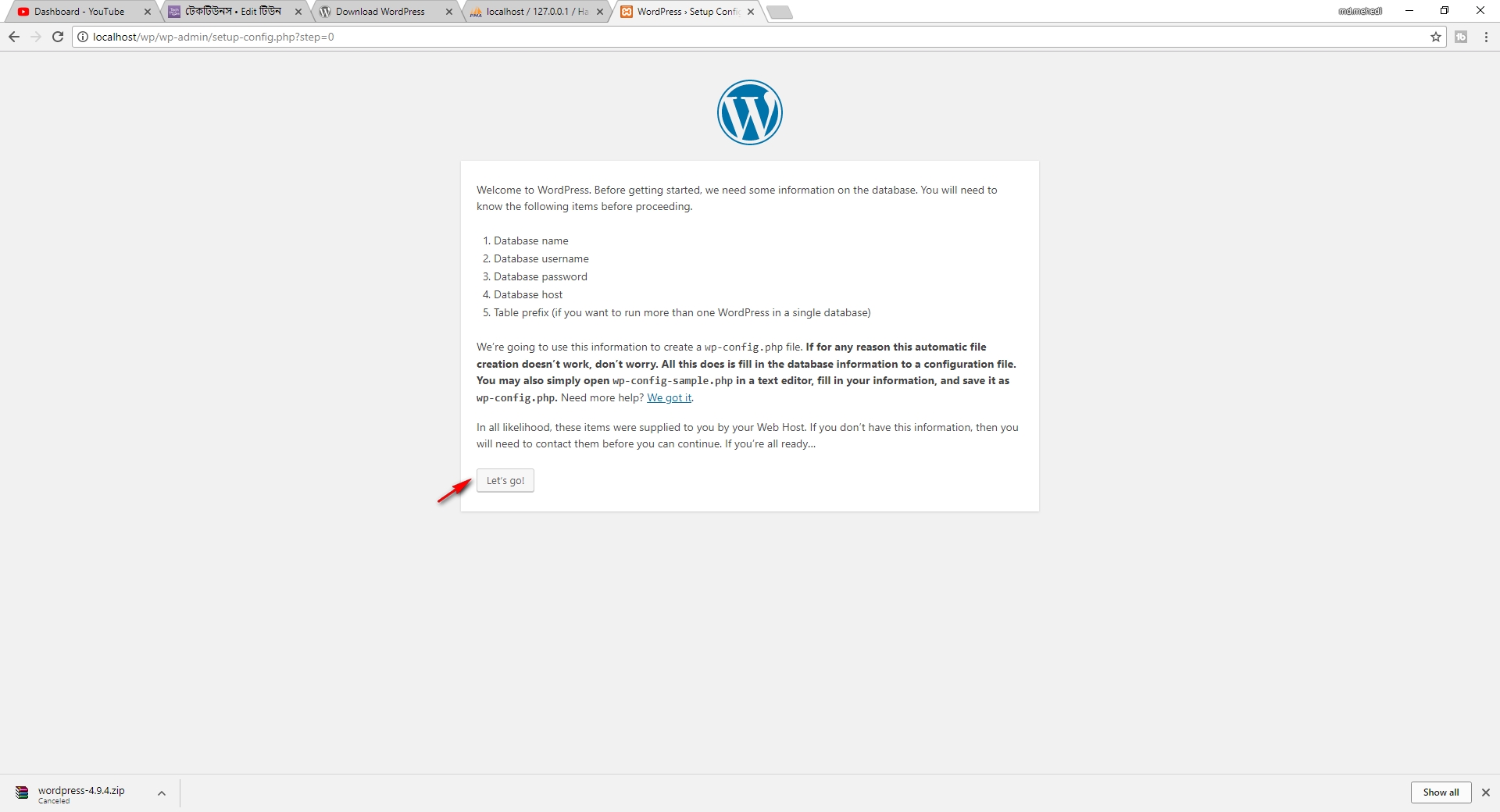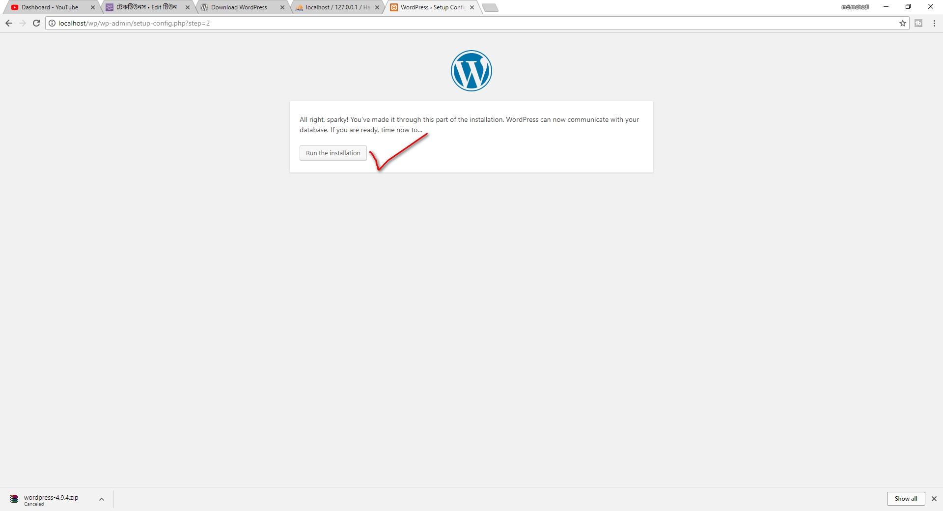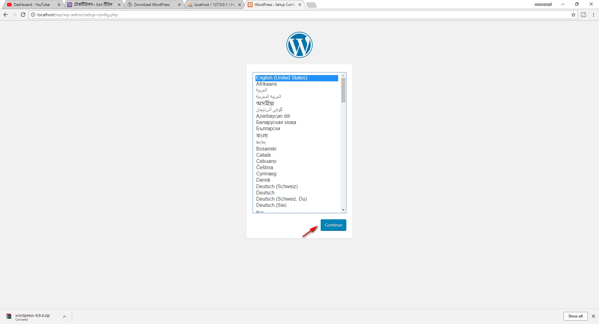 আপনার ব্রাউজার ওপেন করে ব্রাউজারে লিখুন localhost/wp এবং নিচের ধাপ অনুসরন করুন।