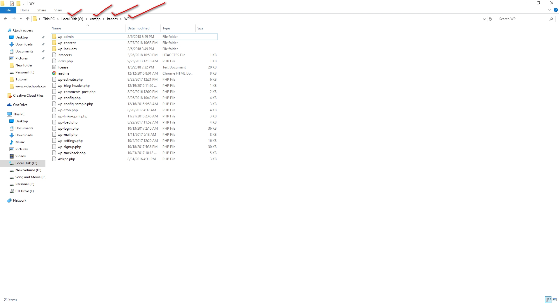 এবার আপনার কম্পিউটারের LOCAL DISK C Drive open করে XAMPP Folder open করবেন তারপরে htdocs Folder open করে নতুন করে WP নামে folder করবেন। তারপর উপরের WordPress ফাইল গুলি কপি করে WP নামের তৈরী করা Folder এ paste করি।