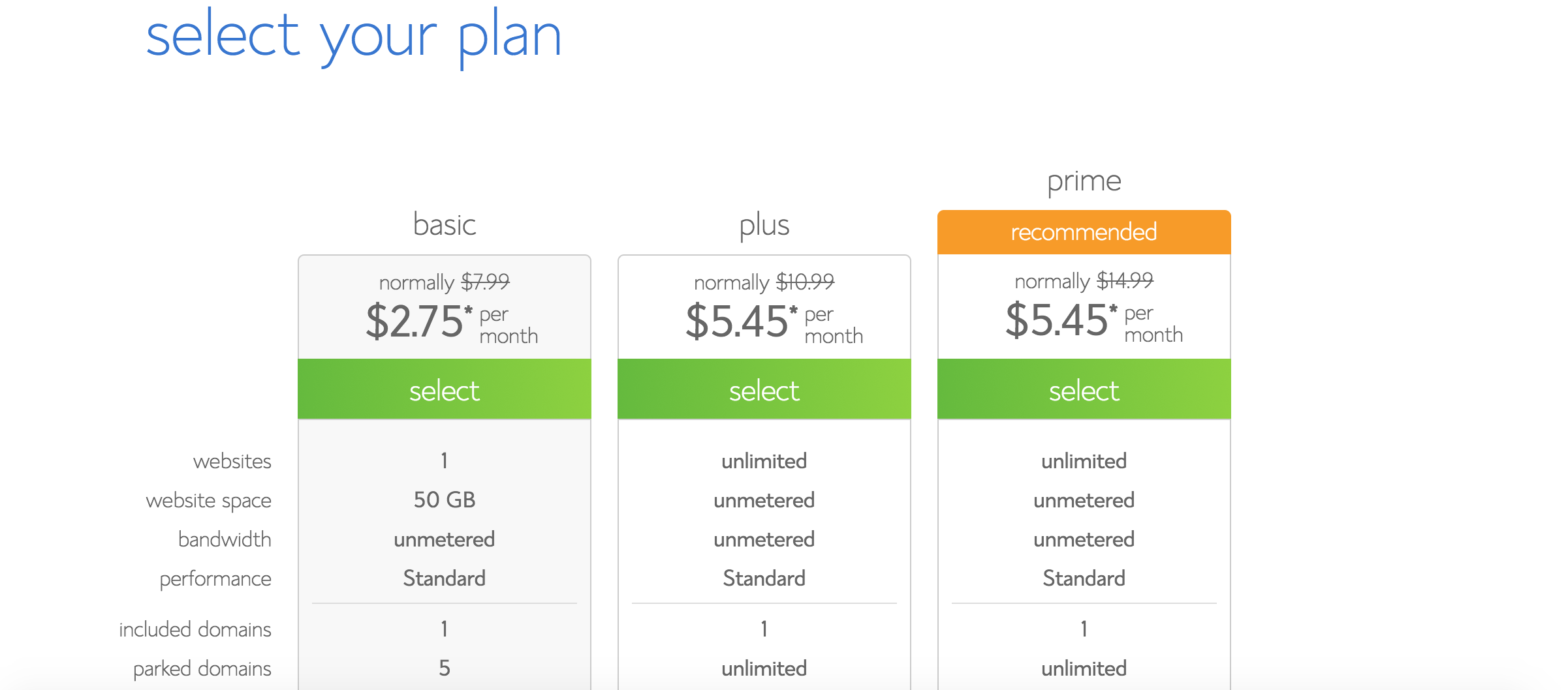 একবার আপনি "এখন শুরু করুন" ক্লিক করুন, আপনি আপনার পছন্দের হোস্টিং প্ল্যানটি নির্বাচন করতে একটি পৃষ্ঠায় নিয়ে যাবেন।