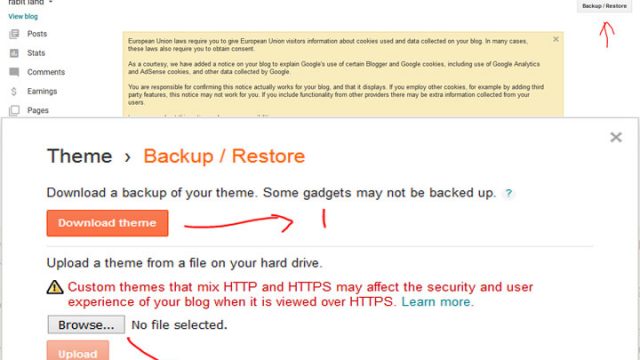 ৪. এবার theme option -এ ক্লিক করে right side-এ "backup/restore" বাটনটিতে ক্লিক করুন। এবার আপনি যদি কোনো টিউন লিখে থাকেন ওই ব্লগে তাহলে "download theme" -এ ক্লিক করুন। আর যদি কোনো টিউন না লখে থাকেন তাহলে "browser" বাটনে ক্লিক করে blog theme select করুন এবং নীচের upload বাটনে ক্লিক করুন। কারন "blogger theme" আপনার ব্লগসাইটকে আরও দেখতে সুন্দর ও মানুষের প্রতি আকৃষ্ট করবে। আমি নীচে কতকগুলো blogger theme -এর নাম দিলাম আশা করি এগুলোর মধ্যে আপনার যেকোনো একটি পছন্দ হবে। এই নামগুলো google-এ সার্চ করে আপনি ফ্রি-তে theme গুলো download করে ব্যবহার করতে পারেন। তবে মনে রাখবেন, সব blogger themes zip file-এর হয়ে থাকে সুতরাং, file টি unzip করে শুধুমাত্র.xml file টা upload করুন।
