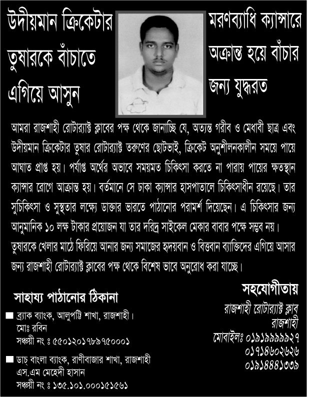 আমার রাজশাহী রোয়ারাক্ট ক্লাব এর সদস্য রো তরুনের ছোট ভাই মেধাবী অ উদিওমান ক্রিকেটার তুশার কেন্সার এ আক্রান্ত।তার চিকিৎসার জন্য প্রায় ১০ লক্ষ টাকা দরকার ।যা তার পরিবার এর পক্ষে যোগান দেয়া সম্ভব না।আসা করি আপনারা সবাই তুসারের পাশে দাড়াবেন।আমরা সবাই তুসার এর পরিবার এর পাশে দাড়ালে হ্য়ত তুসার আবার আমাদের মাঝে সুস্থ হয়ে ফিরে আশতে পারে।বিস্তারিত জানতে কিলিক করুন এই লিঙ্ক (fesbook)এ .