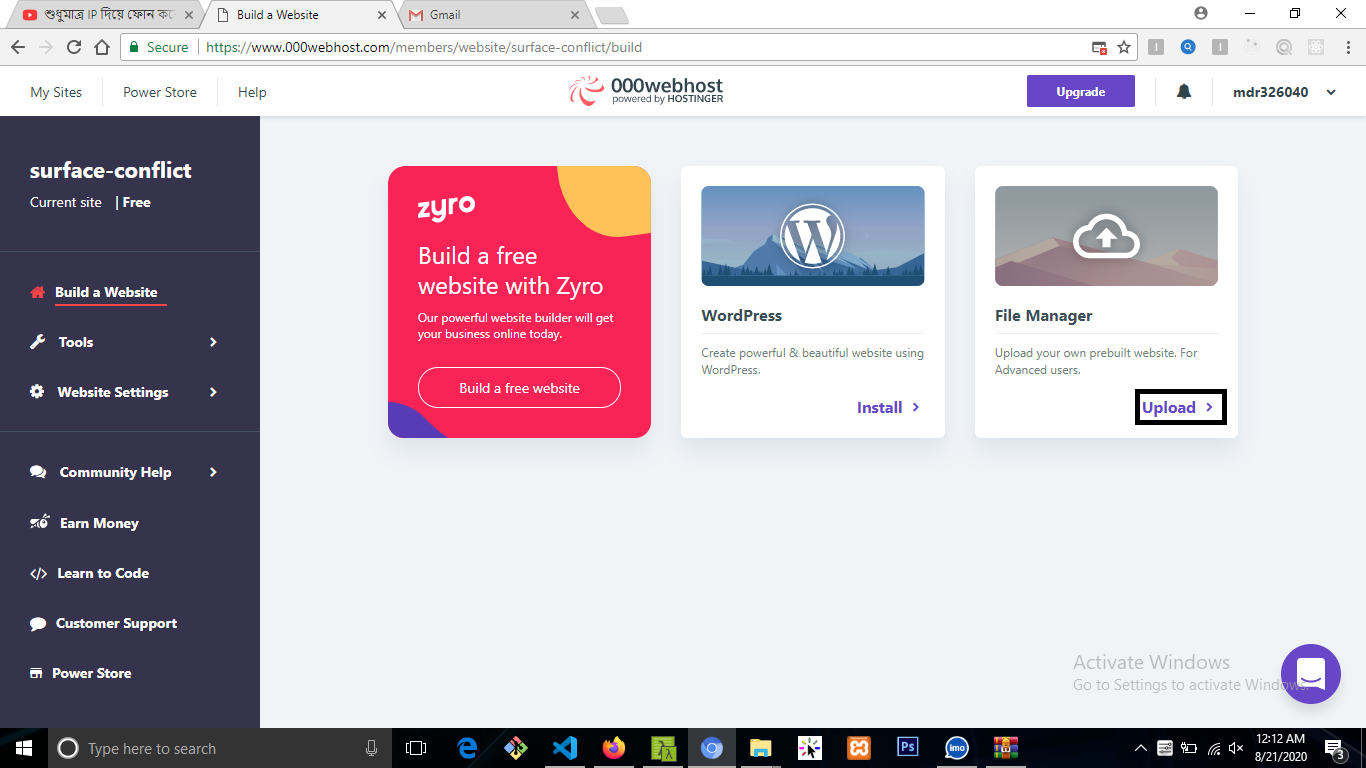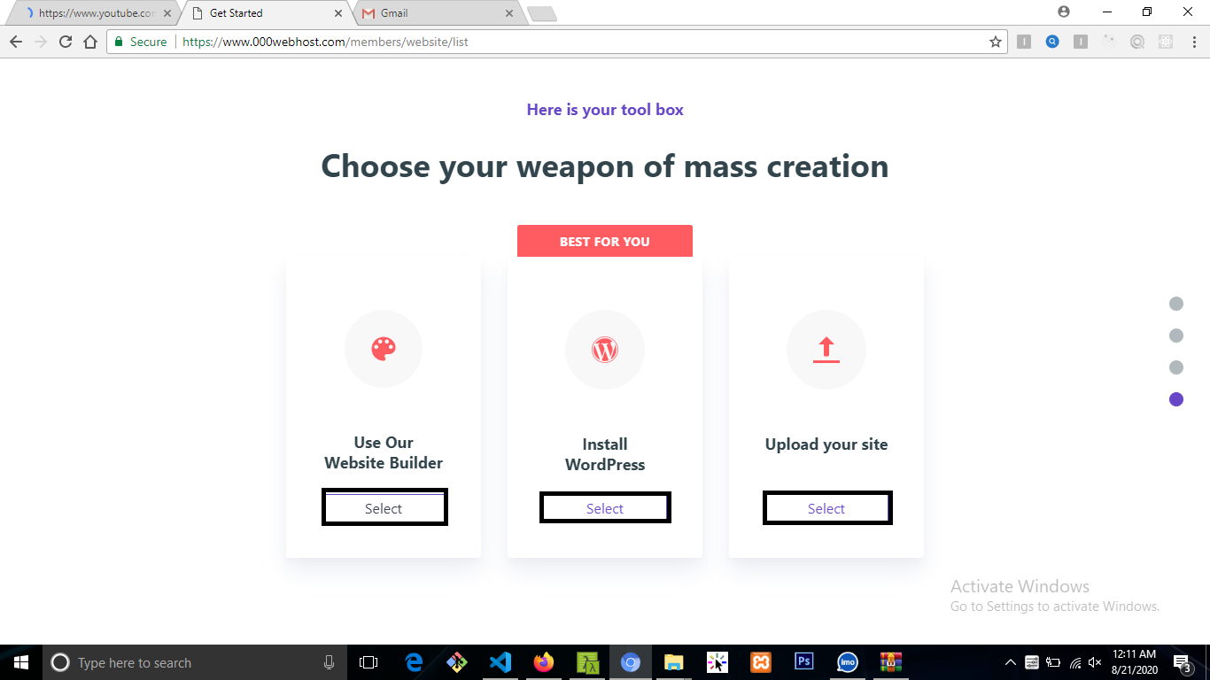 আপনার কাছে ওয়েব সাইট এর CMS এর অপশন আসবে। আপনি চাইলে এখান থেকে সরাসরি ওয়ার্ডপ্রেস ইনস্টল করতে পারেন। আর আপনি যদি চান আপনার তৈরি কৃত কোন ওয়েব সাইট এখানে আপলোড করবেন তাহলে Upload Your Site অপশনে থাকা Select বাটনে ক্লিক করুন।